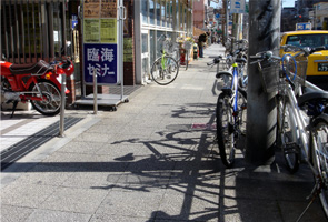 歩道が狭く自転車がはみ出してしまう元町バス停付近(右)