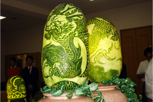 祭壇には、調理師の皆さんの技術の粋を凝らした見事な飾り彫りが並べられ、お店では提供されないような各店自慢の珍味が供せられます。
