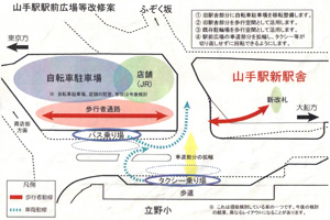 大きな変更点は、駅改札の移転に伴い、現在使用している改札口周辺を、歩行者通路と自転車駐車場や店舗にすることと、立野小学校下の自転車駐車場を撤去し歩行者通路にすることで駅前ロータリーの車両通行部分を広げることの2点でしょう。