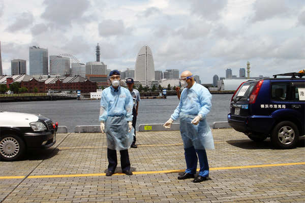 14日、港湾局による新型インフルエンザ対処訓練を視察しました。1879年に「コレラ病感染予防規則」が公布された「検疫の日」に毎年訓練を行ってはどうかという、わが党の牧嶋議員の提案で、横浜検疫所との合同訓練が実施されたものです。客船の「集約港」となる横浜港大さん橋から、新型インフルエンザの重篤な症状を呈した乗客を市民病院に搬送するという想定の訓練です。船こそありませんでしたが、水上署のパトカーも参加して想定訓練を終えました。